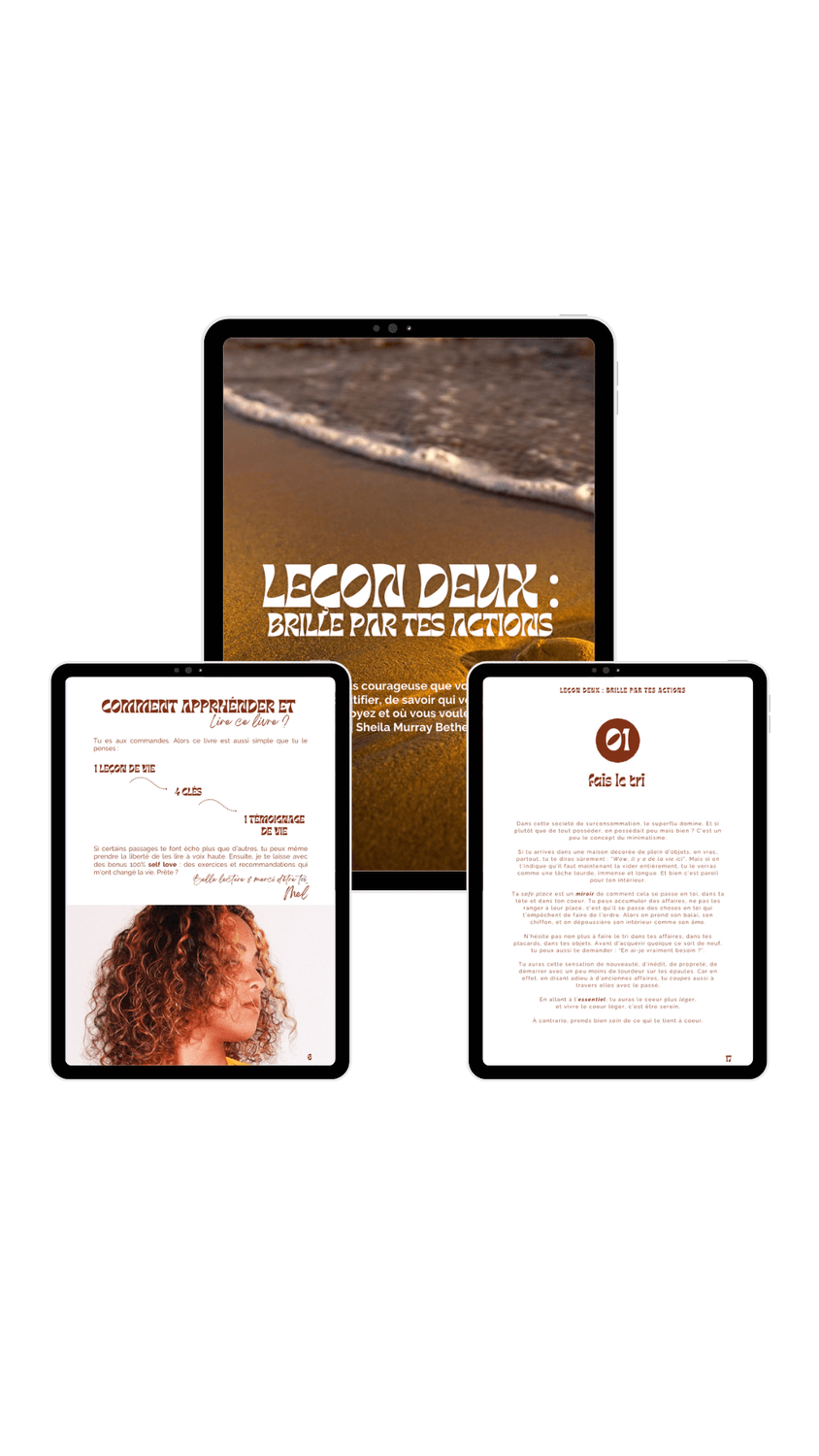 → 4 leçons de vie inspirantes pour booster ton évolution et t’aider à rayonner pleinement. → 16 conseils impactants à intégrer facilement dans ton rituel quotidien pour transformer ta routine. → Des témoignages authentiques et des expériences de vie partagées à cœur ouvert pour te guider sur ton chemin.